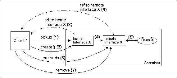 4. Home interface X instantiates remote interface X. The container instantiates the bean for this client and is destroyed only when the client invokes the remove.
