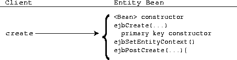 An entity bean is similar to a session bean in that certain callback methods, such as ejbCreate, are invoked at specified times. Entity beans use callback functions for managing its persistent data, primary key, and context information. The following diagram shows what methods are called when an entity bean is created.