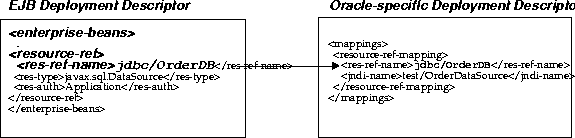 As shown in Figure A-2, the JDBC DataSource was bound to the JNDI name "test/OrderDataSource". The logical name that the bean knows this resource as is "jdbc/OrderDB". These names are mapped together within the Oracle-specific deployment descriptor. Thus, within the bean's implementation, the bean can retrieve the connection to OrderDataSource by using the "java:comp/env/jdbc/OrderDB" environment element.