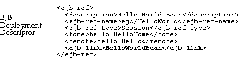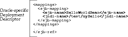 As shown in Figure A-1, the logical name for the bean is mapped to the JNDI name by providing the same link name, "HelloWorldBean", in both the <ejb-link> in the EJB deployment descriptor and the <ejb-name> within the <ejb-mapping> element in the Oracle-specific deployment descriptor.