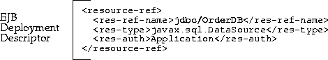 The environment element is defined within the EJB deployment descriptor by providing the logical name, "jdbc/OrderDB", its type of javax.sql.DataSource, and the authenticator of "Application".