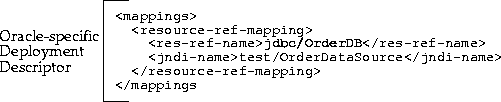 The environment element of "jdbc/OrderDB" is mapped to the JNDI bound name for the connection, "test/OrderDataSource" within the Oracle-specific deployment descriptor.