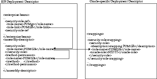 As shown in Figure A-4, the <role-name> of POMGR defined in the <assembly-descriptor><security-role><role-name> is mapped to SCOTT within the Oracle-specific deployment descriptor in the <security-role-mapping> element.