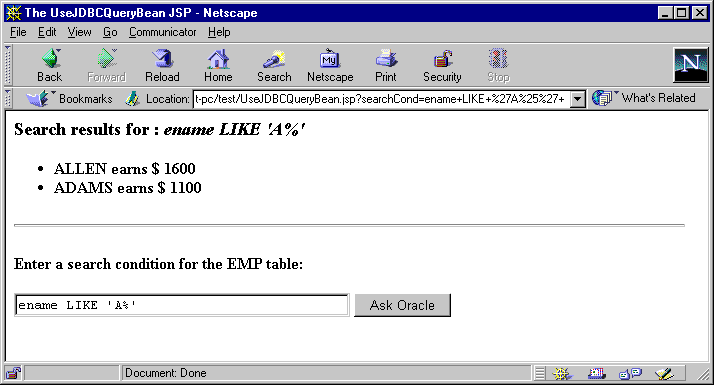 <%@ page language="java" import="java.sql.*" %> <HTML> <HEAD> <TITLE> The JDBCQuery JSP </TITLE> </HEAD> <BODY BGCOLOR="white"> <% String searchCondition = request.getParameter("cond"); if (searchCondition != null) { %> <H3> Search results for <I> <%= searchCondition %> </I> </H3> <B> <%= runQuery(searchCondition) %> </B> <HR><BR> <% } %> <B>Enter a search condition:</B> <FORM METHOD="get"> <INPUT TYPE="text" NAME="cond" SIZE=30> <INPUT TYPE="submit" VALUE="Ask Oracle"); </FORM> </BODY> </HTML> <%-- Declare and define the runQuery() method. --%> <%! private String runQuery(String cond) throws SQLException { Connection conn = null; Statement stmt = null; ResultSet rset = null; try { DriverManager.registerDriver(new oracle.jdbc.driver.OracleDriver()); conn = DriverManager.getConnection("jdbc:oracle:oci8:@", "scott", "tiger"); stmt = conn.createStatement(); // dynamic query rset = stmt.executeQuery ("SELECT ename, sal FROM scott.emp "+ (cond.equals("") ? "" : "WHERE " + cond )); return (formatResult(rset)); } catch (SQLException e) { return ("<P> SQL error: <PRE> " + e + " </PRE> </P>\n"); } finally { if (rset!= null) rset.close(); if (stmt!= null) stmt.close(); if (conn!= null) conn.close(); } } private String formatResult(ResultSet rset) throws SQLException { StringBuffer sb = new StringBuffer(); if (!rset.next()) sb.append("<P> No matching rows.<P>\n"); else { sb.append("<UL>"); do { sb.append("<LI>" + rset.getString(1) + " earns $ " + rset.getInt(2) + ".</LI>\n"); } while (rset.next()); sb.append("</UL>"); } return sb.toString(); } %>