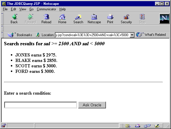 The following example creates a query dynamically, from search conditions that the user enters through an HTML form (typed into a box and entered with an Ask Oracle button). To perform the specified query, it uses JDBC code in a method called runQuery() that is defined in a JSP declaration. It also defines a method formatResult() within the JSP declaration to produce the output. The runQuery() method uses the scott schema with password tiger. (JDBC is used instead of SQLJ because the query is formed dynamically. SQLJ is for static SQL.)