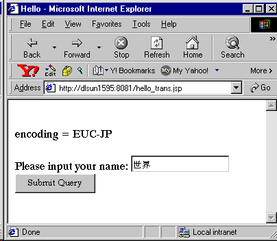 The following sample accepts a user name in Japanese characters and correctly outputs the name back to the browser. In a servlet environment that cannot encode multibyte request parameters, this sample depends on the OracleJSP configuration setting of translate_params=true.