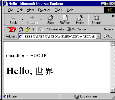 <%@ page contentType="text/html; charset=EUC-JP" %> <HTML> <HEAD> <TITLE>Hello</TITLE></HEAD> <BODY> <% //charset is as specified in page directive (EUC-JP) String charset = response.getCharacterEncoding(); %> <BR> encoding = <%= charset %> <BR> <% String paramName = "XXYY"; paramName = new String(paramName.getBytes(charset), "ISO8859_1"); String paramValue = request.getParameter(paramName); if (paramValue == null || paramValue.length() == 0) { %> <FORM METHOD="GET"> Please input your name: <INPUT TYPE="TEXT" NAME="XXYY" value="AABB" size=20> <BR> <INPUT TYPE="SUBMIT"> </FORM> <% } else { paramValue= new String(paramValue.getBytes("ISO8859_1"), "EUC-JP"); %> <H1> Hello, <%= paramValue %> </H1> <% } %> </BODY> </HTML>