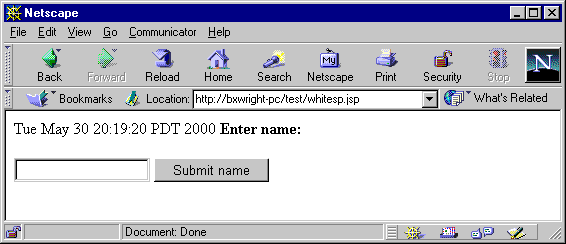 <HTML> <BODY> <%= new java.util.Date() %> <% String user=request.getParameter("user"); %> <%= (user==null) ? "" : user %> <B>Enter name:</B> <FORM METHOD=get> <INPUT TYPE="text" NAME="user" SIZE=15> <INPUT TYPE="submit" VALUE="Submit name"> </FORM> </BODY> </HTML>