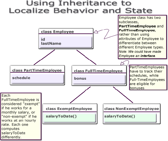 In addition, you could create an entirely new class that does not inherit from Employee at all--Contractor--and implement a compensationToDate() method in it. A program that calculates total payroll to date would iterate over all people on payroll, regardless of whether they were full-time, part-time, or contractors, and add up the values returned from invoking the compensationToDate() method on each. You can safely make changes to the individual compensationToDate() methods with the knowledge that callers of the methods will work correctly. For example, you can safely add new fields to existing classes.