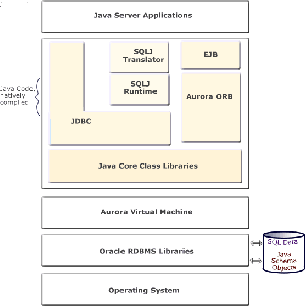 Figure 1-4 illustrates how Oracle's Java applications sit on top of the Java core class libraries, which in turn sit on top of the JVM. Because Oracle's Java support system is located within the database, the JVM interacts with the Oracle database libraries, instead of directly with the operating system.