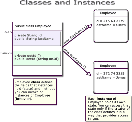 When you create an object from a class, you are creating an instance of that class. The instance contains the fields of an object, which are known as its data, or state. Figure 1-1 shows an example of an Employee class defined with two attributes: last name (lastName) and employee identifier (ID).
