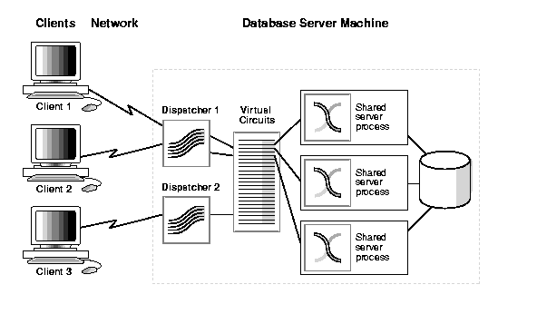 The MTS architecture eliminates the need for a dedicated server process for each connection (see Figure 9-1). A dispatcher directs multiple incoming network session requests to a pool of shared server processes. An idle shared server process from a shared pool of server processes picks up a request from a common queue. This means a small number of shared servers can perform the same amount of processing as many dedicated servers. Also, since the amount of memory required for each user is relatively small, less memory and process management are required, and more users can be supported.