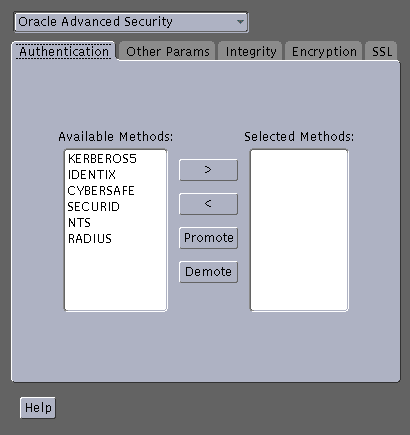SQLNET.AUTHENTICATION_SERVICES = (RADIUS|CYBERSAFE|KERBEROS5|SECURID|IDENTIX)