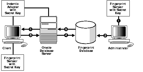 Each user who wants to use the system must place a fingerprint on a TouchSafe II or TouchSafe II Desktop Sensor. The client-side adapter sends an authentication request to the server-side adapter which uses the previously enrolled fingerprint stored in the authentication server for comparison. For each authentication request from a client, the authentication server retrieves and sends the user's fingerprint and the database server's security policy back to the client-side adapter via the server-side adapter.