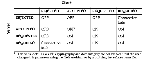To negotiate whether to turn on encryption or integrity, you can specify four possible values for the Oracle Advanced Security encryption and integrity configuration parameters. The four values are listed in the order of increasing security. The value REJECTED provides the minimum amount of security between client and server communications, and the value REQUIRED provides the maximum amount of network security: