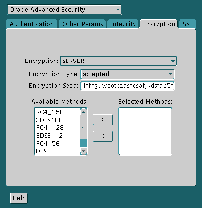 Note: Under Oracle Advanced Security Release 8.1.7, two integrity algorithms are available: MD5 and SHA-1. MD5 can be enabled or disabled by using the Oracle Advanced Security tabbed window displayed under Configuring Integrity on the Client and the Server.