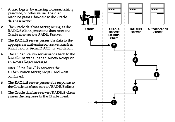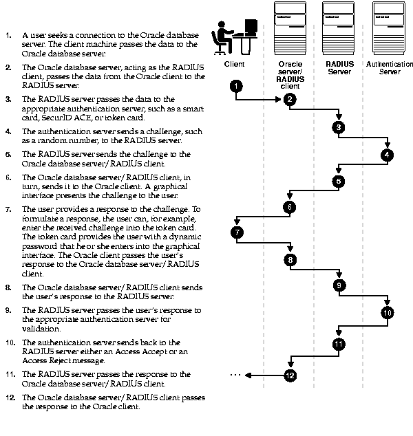From the user's perspective, the entire authentication process is transparent. When the user seeks access to an Oracle database server, the Oracle database server, acting as the RADIUS client, notifies the RADIUS server. The RADIUS server:
