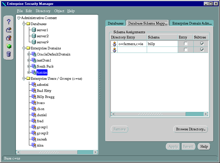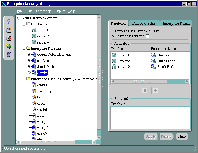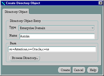An enterprise domain contains databases and enterprise roles. You can create a new enterprise domain by naming it, and defining where it is to be located in the directory.