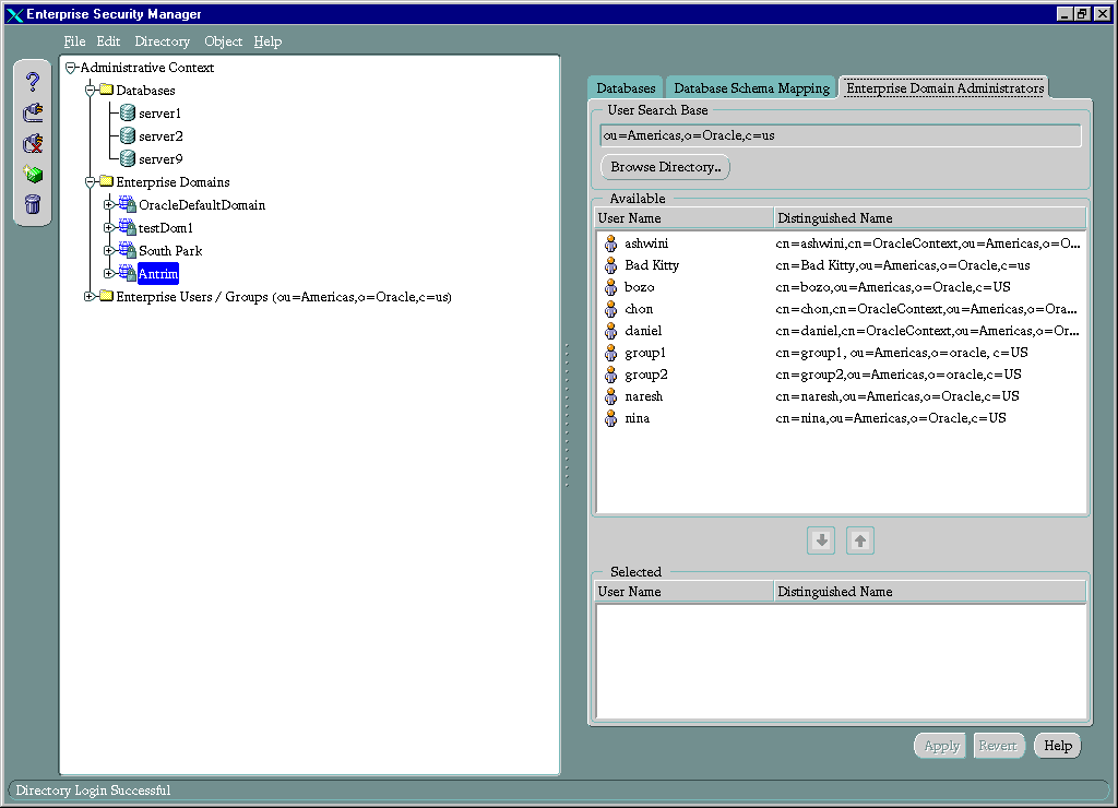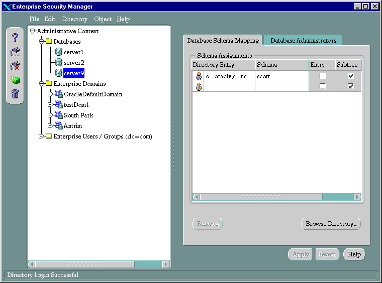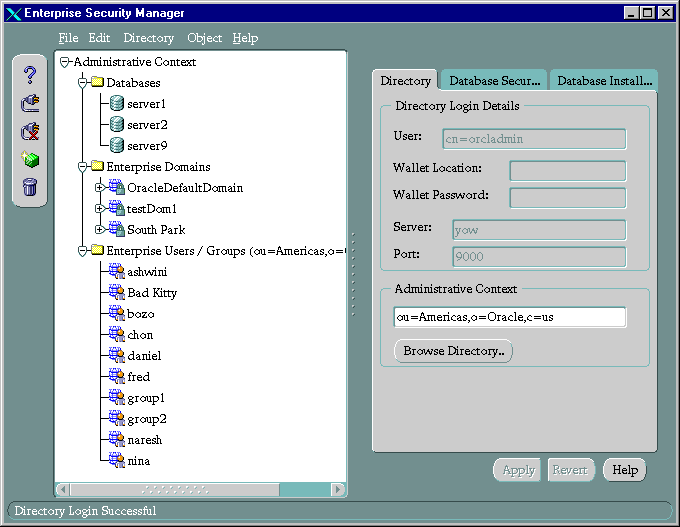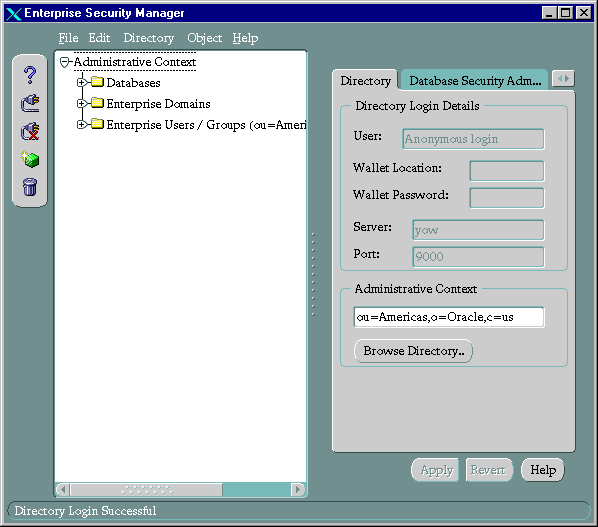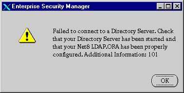 If this happens, exit Oracle Enterprise Security Manager and run Net8 Configuration Assistant to set up directory access, then restart Oracle Enterprise Security Manager. Alternatively, you can: