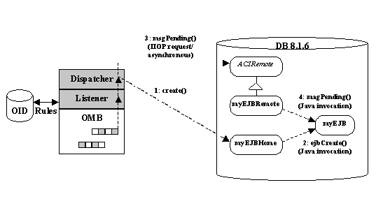 Figure 14-2 illustrates the asynchronous invocation of a notification-driven bean of type "MyEJB". Oracle Message Broker first creates an EJB by invoking the "create" operation of the EJB "Home" object (1). As a result of this request, the EJB receives an invocation to its "ejbCreate" method (2). Then, Oracle Message Broker sends an asynchronous invocation to the "msgPending" operation of the EJB "Remote" object (3), which leads to the actual invocation of the "msgPending" method of the bean (4).