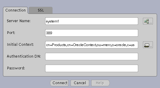 When you start Oracle Message Broker Manager, you need to connect to an LDAP Directory server. The LDAP Connection dialog box (Figure 11-1) prompts you for the server name, port number, initial context, authentication DN, and password for the LDAP server. The program supplies default values for these fields using the OMB_LP environment variable. If you want to change the default values, make your selections in the dialog box.