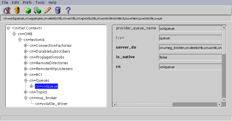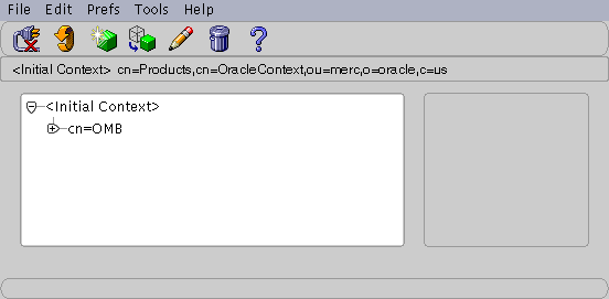 When Oracle Message Broker Manager first opens, the Navigator pane shows only one tree item, "<Initial Context>." By clicking the plus sign(+) next to the tree item, subcomponents of that tree item appear. Tree items that have plus signs in front of them may have their own sub-tree items. The plus sign becomes a minus sign (-) when the entry is expanded. You can expand and contract the tree by clicking the plus signs and minus signs.