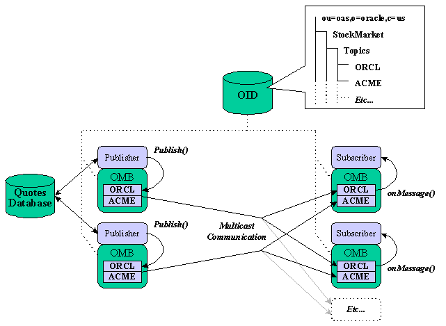 In this application, the publishers retrieve quotes from the databases and publish them to topics. The application supports any number of subscribers. Each subscriber subscribes to topics according to its interest, and receives quotes asynchronously. Topics can be mapped to individual stock quotes (for example, ORCL, for Oracle Corp. quotes), or to sets of similar stock quotes (for example, the high-tech market).