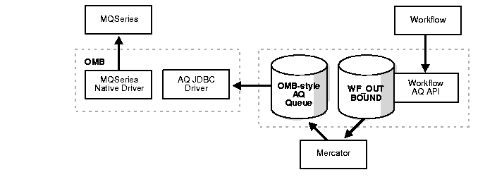 Mercator subscribes to the WF_OUTBOUND queue, transforms the message into an OMB-style JMS format, and places it in an OMB-style AQ queue. OMB propagates the message between the AQ queue and the MQSeries queue.