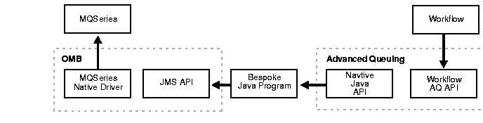 In this variant, you develop an adapter that uses the Workflow AQ API to record the asynchronous message. You develop a simple, predefined Java program that gets the message through the native Java AQ API, sets the relevant JMS properties, and passes the message to Oracle Message Broker, which records the message in the MQSeries queue.