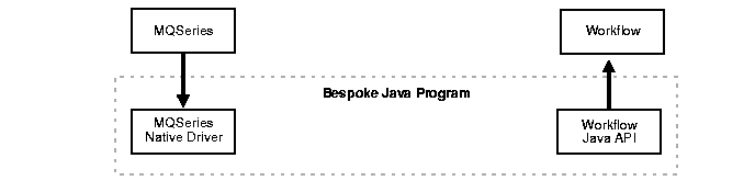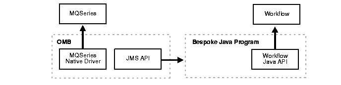 In this variant, you write a simple, predefined Java program that gets the message through the MQSeries native Java API and transforms the message payload into the required parameter format before invoking the Java Workflow method that instantiates the business process.