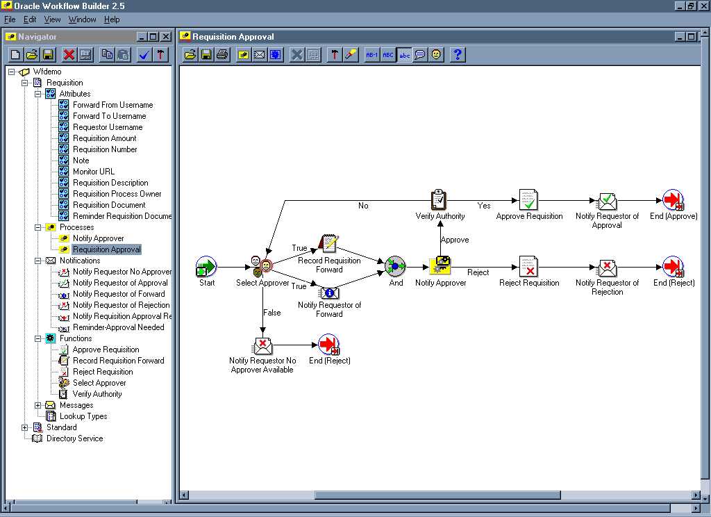 The following diagram depicts a simplified workflow process definition that routes a requisition to a manager or set of managers for approval.