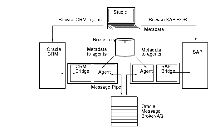 For each application participating in a specific integration, Applications InterConnect attaches an adapter to it. At runtime, the adapter retrieves the metadata from the Repository to determine the format of messages, and perform transformations between the various data formats, and route the messages to th3e appropriate queues under OMB.
