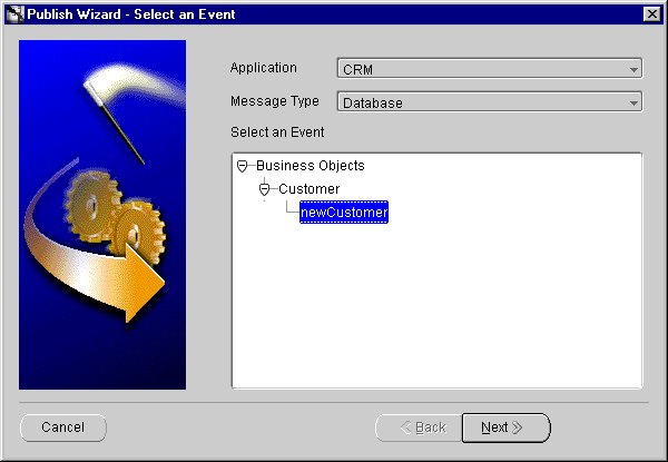 First, an event called "NewCustomerEvent" is created. When you create this object for the first time, the assigned owner is Oracle and the version is V1. This even is NewCustomerEvent/Oracle/V1.