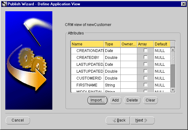 After selecting the event to publish, you define the application view. The application view window is initially an empty table. You may define the attributes by using the add button, or importing the definitions from a database or an API Repository.