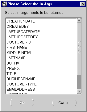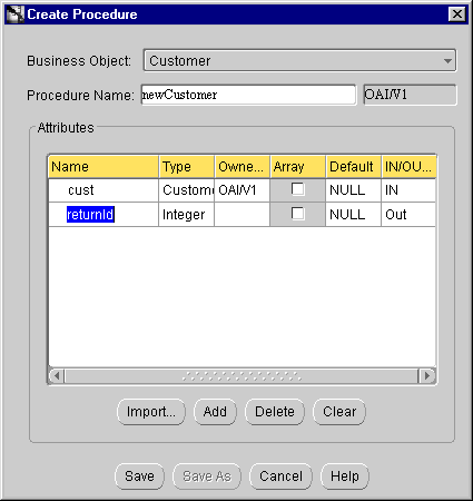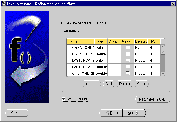 After selecting the procedure to invoke, you define the application view. The application view window is initially an empty table. You may define the attributes by using the add button, or importing the definitions from a database or an API Repository.