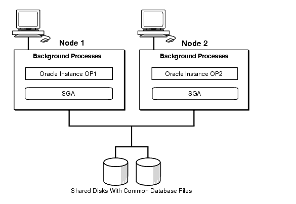 Figure 1-1 shows the relationship between two Oracle instances and the shared disks on which the data files are stored:
