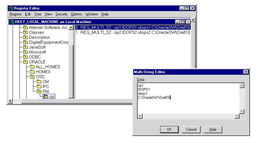 The following Registry Editor graphic shows a subkey of op with values entered for instance op1: