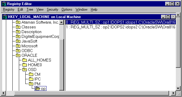 op contains entries for two instances named op1 and op2. The registry values names are node numbers for the instances, starting at 0 for the first node. The second node has a sequential value of 1. These registry values are described in the following table: