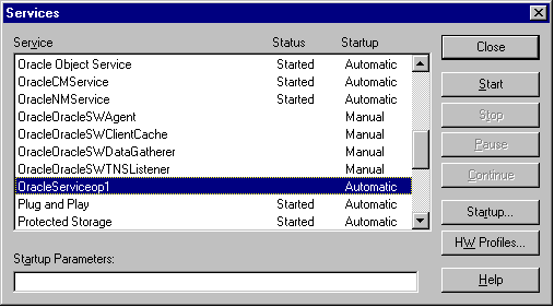 Each node is configured with an OracleServicesid service for the instance on that node. It is a Windows NT service that can be controlled from the Control Panel.