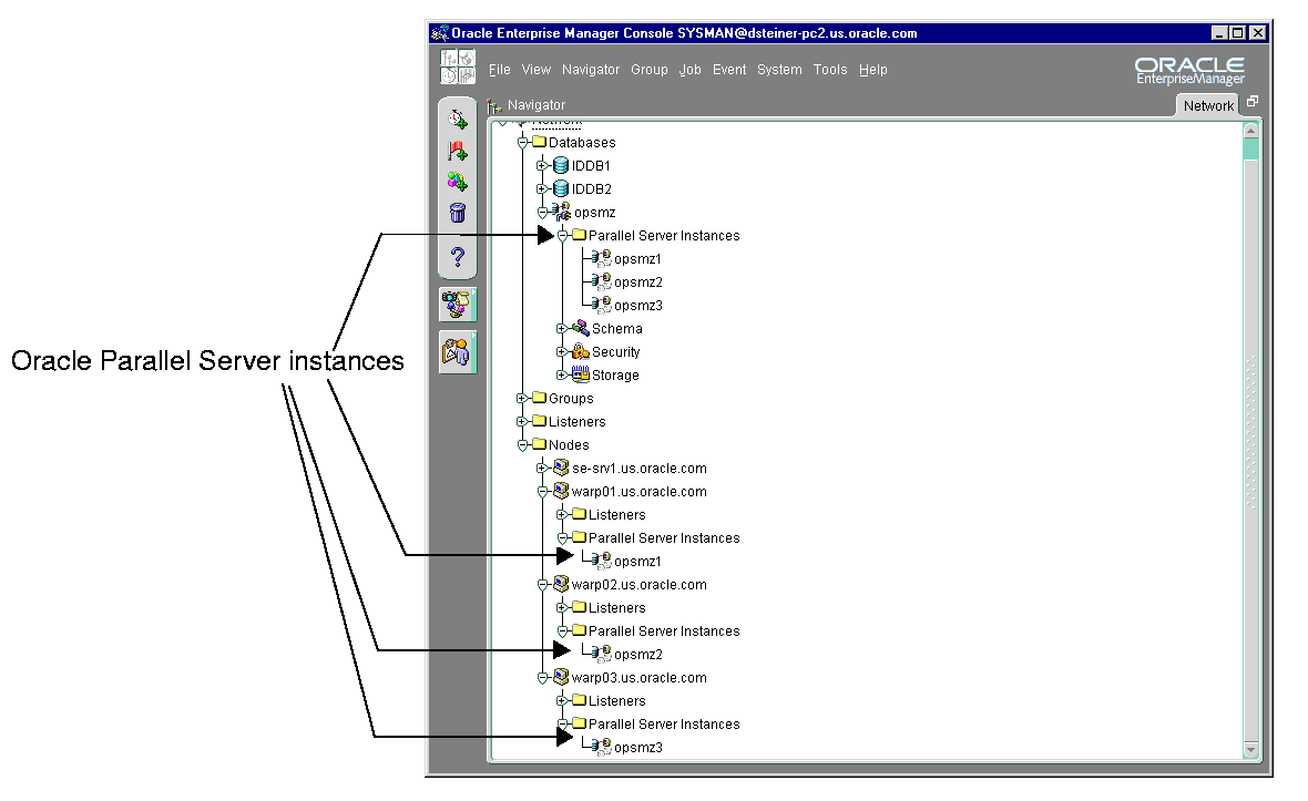 From the Navigator window, Oracle Parallel Servers are located in the Databases folder which contains entries for single-instance and Oracle Parallel Server databases. Each Oracle Parallel Server folder contains the instances and sub-folders for schema, security and file storage.