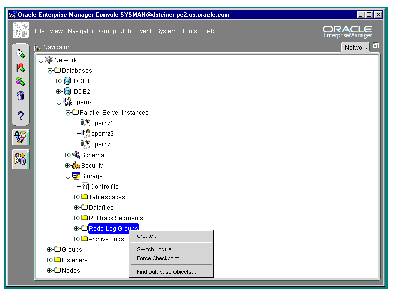 An Oracle Parallel Server database's subfolders behave just as they do for single-instance databases. By right-clicking the mouse on these objects, property sheets can be accessed to inspect and modify properties of these objects just as for single-instance databases. For example, right-clicking on the Redo Log Groups folder and choosing Create can add a new redo log group.