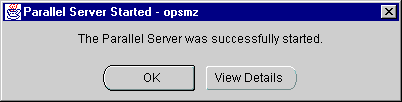 If the instances were started successfully, the Parallel Server Started message box appears with a successful message: