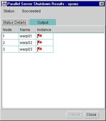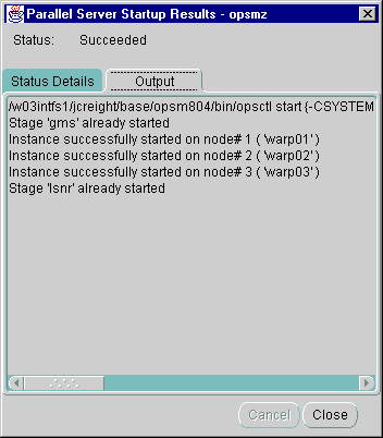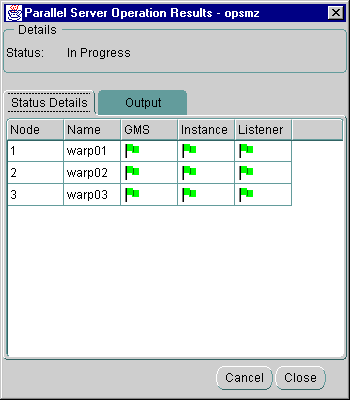While a startup or shutdown operation is running against an Oracle Parallel Server, the Status Details tab progress display is shown and updated dynamically as the operation progresses.