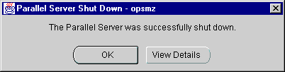 If the instances were shut down successfully, the Parallel Server Stopped message box appears with a successful message.: