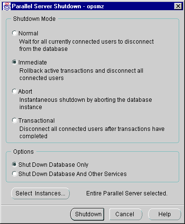 The Console allows you to shut down an Oracle Parallel Server database or individual instances.