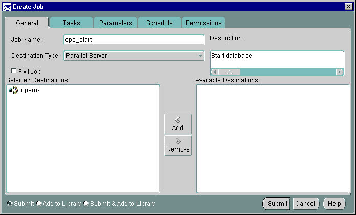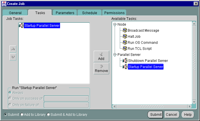 From the Tasks tab, choose the task(s) that you want the job to perform. The list of tasks that appear is different depending on whether you select an Oracle Parallel Server or an Oracle Parallel Server instance as your Destination Type from the General tab.