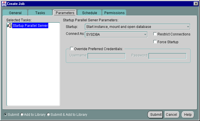 Complete the parameters on the tab and click the Submit button to run the Oracle Parallel Server startup task.