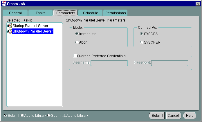From the Parameters tab, you can specify parameter settings for the job tasks you selected on the Tasks tab. The parameters that display vary according to the job task. Parameters for Oracle Parallel Server startup and shutdown tasks are described below.