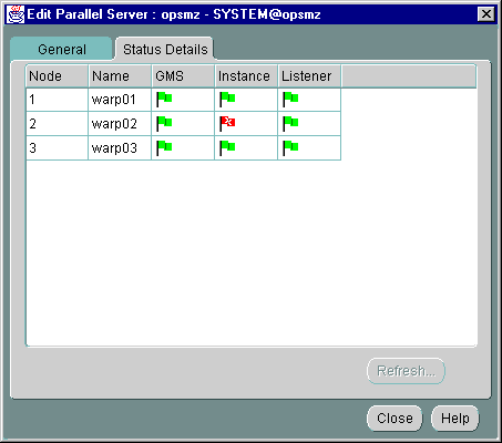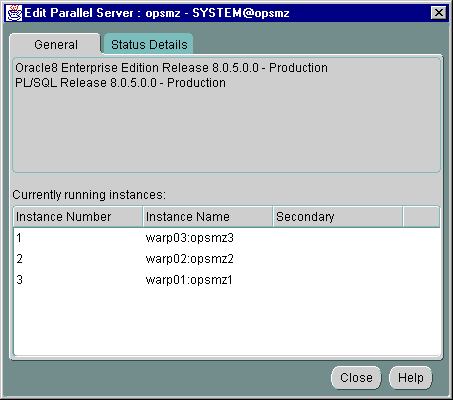 The Status tab displays information about the currently running instances by querying V$ACTIVE_INSTANCES table. Oracle Enterprise Manager makes a connection to the Oracle Parallel Server; therefore, this tab will not appear if the Oracle Parallel Server is down.