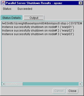Click OK in the Parallel Server Stopped message to acknowledge the message, then click Close in the Parallel Server Shutdown Results.
